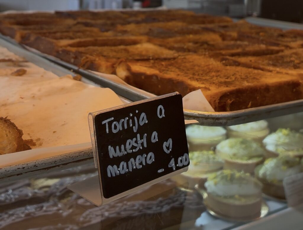 Los clientes entran y salen sin parar y las vitrinas están llenas de dulces irresistibles. Todo invita a quedarse.Y, sobre todo, a probar. Su propuesta premiada no es una torrija al uso. “Se trata de un bizcocho tipo brioche, con sabor a mantequilla, un toque de miel y mousse de canela, con ralladura de naranja y de limón”, explica Teo. El resultado recuerda a la torrija tradicional, pero con un giro inesperado. “Realmente es un trampantojo”, añade Leila.