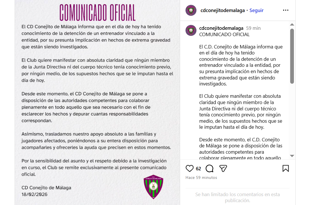 «El C.D. Conejito de Málaga informa que en el día de hoy ha tenido conocimiento de la detención de un entrenador vinculado a la entidad, por su presunta implicación en hechos de extrema gravedad que están siendo investigados», ha empezado el club en una publicación a través de redes sociales, antes de «manifestar con absoluta claridad que ningún miembro de la Junta Directiva ni del cuerpo técnico tenía conocimiento previo, por ningún medio, de los supuestos hechos que se le imputan».