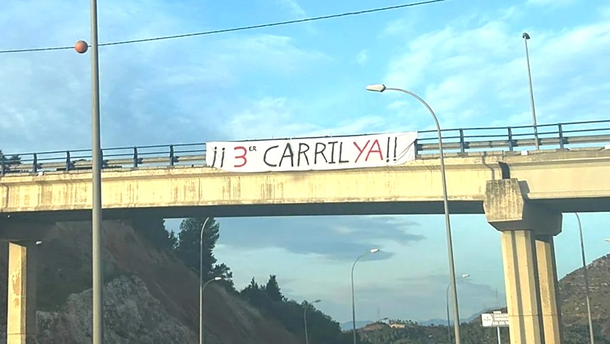 «¡¡Tercer carril ya!!», rezan las dos pancartas puestas en los puentes de la autovía, concretamente en la zona de Añoreta y La Cala del Moral. Se trata de una reivindicación que lleva varios años, pues la situación se va agravando, coincidiendo con el gran crecimiento poblacional que está viviendo la Costa del Sol occidental y oriental.
