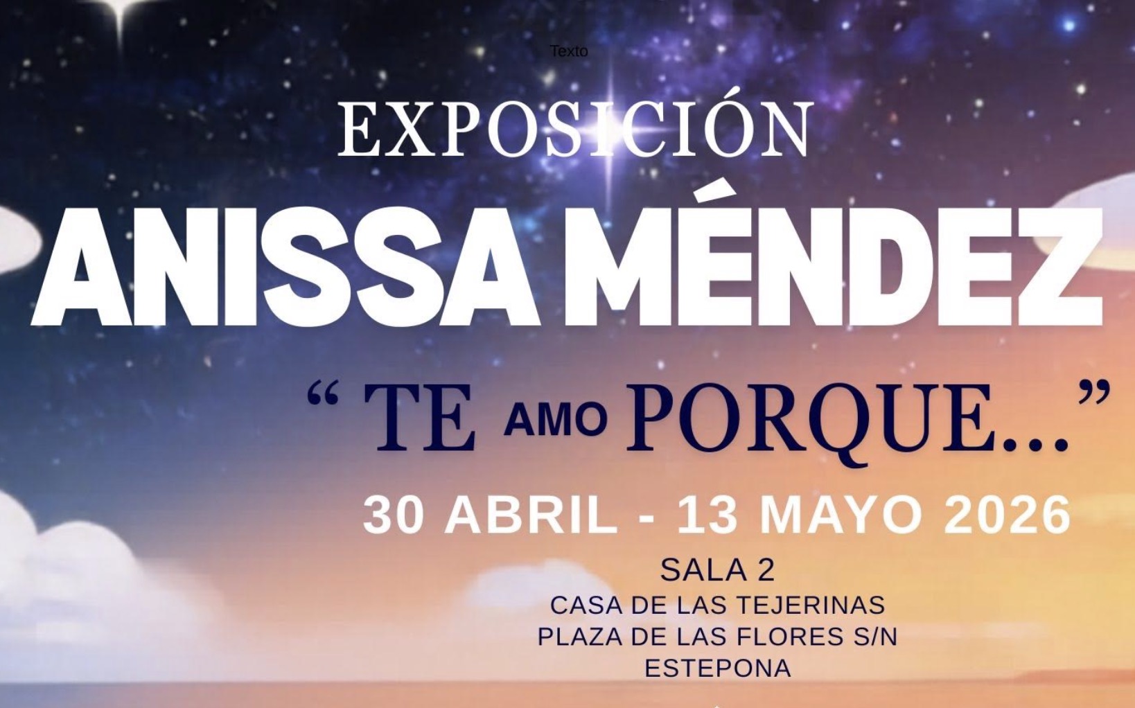 El Ayuntamiento de Estepona informa que la Sala 2 de la Casa de Las Tejerinas, sita en la Plaza de las Flores, acogerá a partir del próximo 30 de abril, una exposición de pinturas de la artista estadounidense, afincada en Estepona, Anissa Méndez.