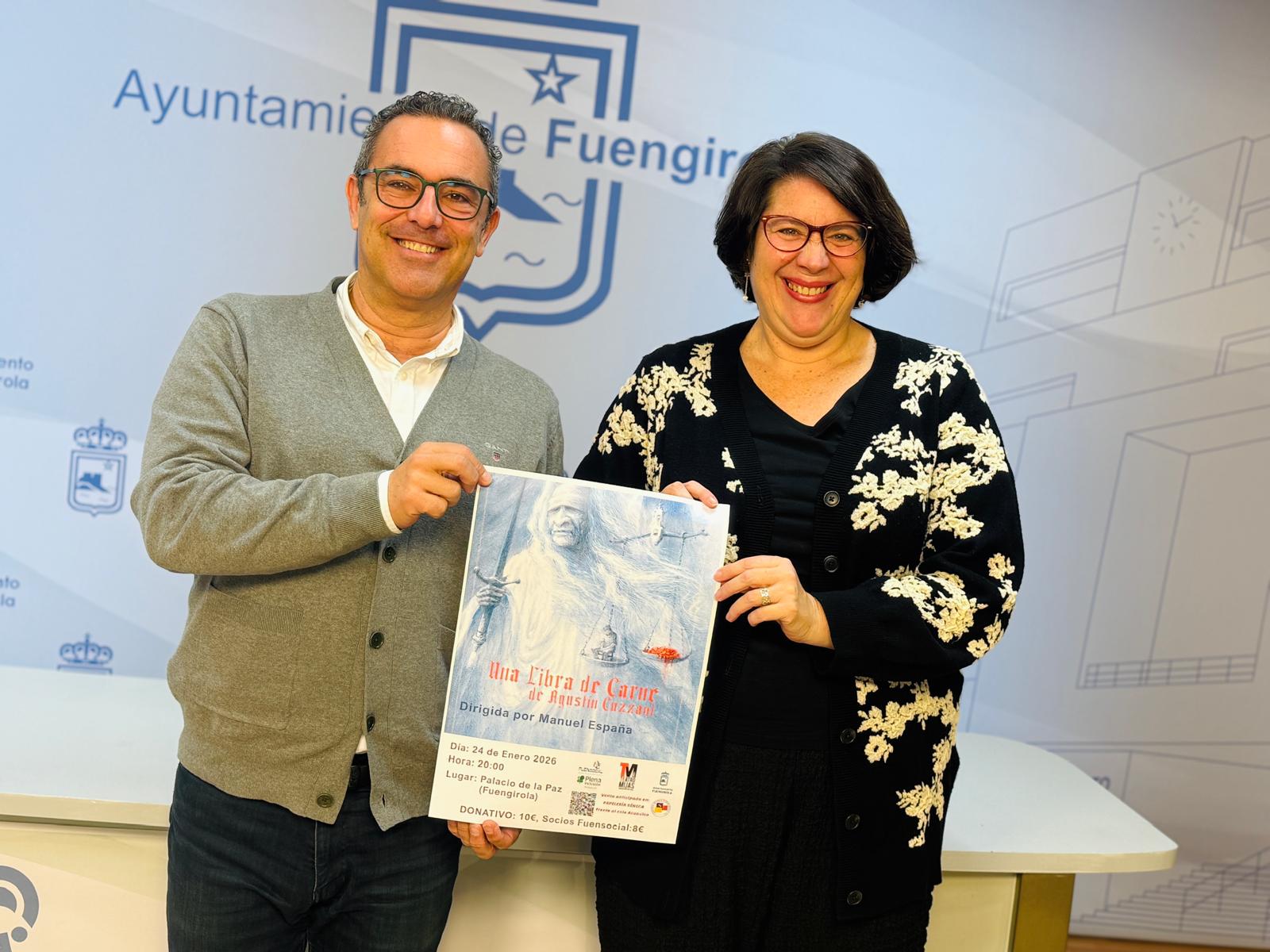 El Palacio de la Paz de Fuengirola acogerá el próximo 24 de enero la representación teatral `Una libra de carne´, de Agustín Cuzzani, que se representará el próximo 24 de enero, a las 20:00 horas. Se trata de una función de carácter solidario, organizada por la Asociación Cultural Teatro Mijas y dirigida por Manuel España, cuya recaudación irá destinada íntegramente a Fuensocial, entidad que desarrolla una destacada labor social en el municipio, tal y como lo han reseñado hoy el concejal de Cultura, Rodrigo Romero, y la edil de Familias, Igualdad y Bienestar Social, Cristina Bornao, quienes además han puesto en valor tanto el interés cultural de la propuesta como su dimensión solidaria.