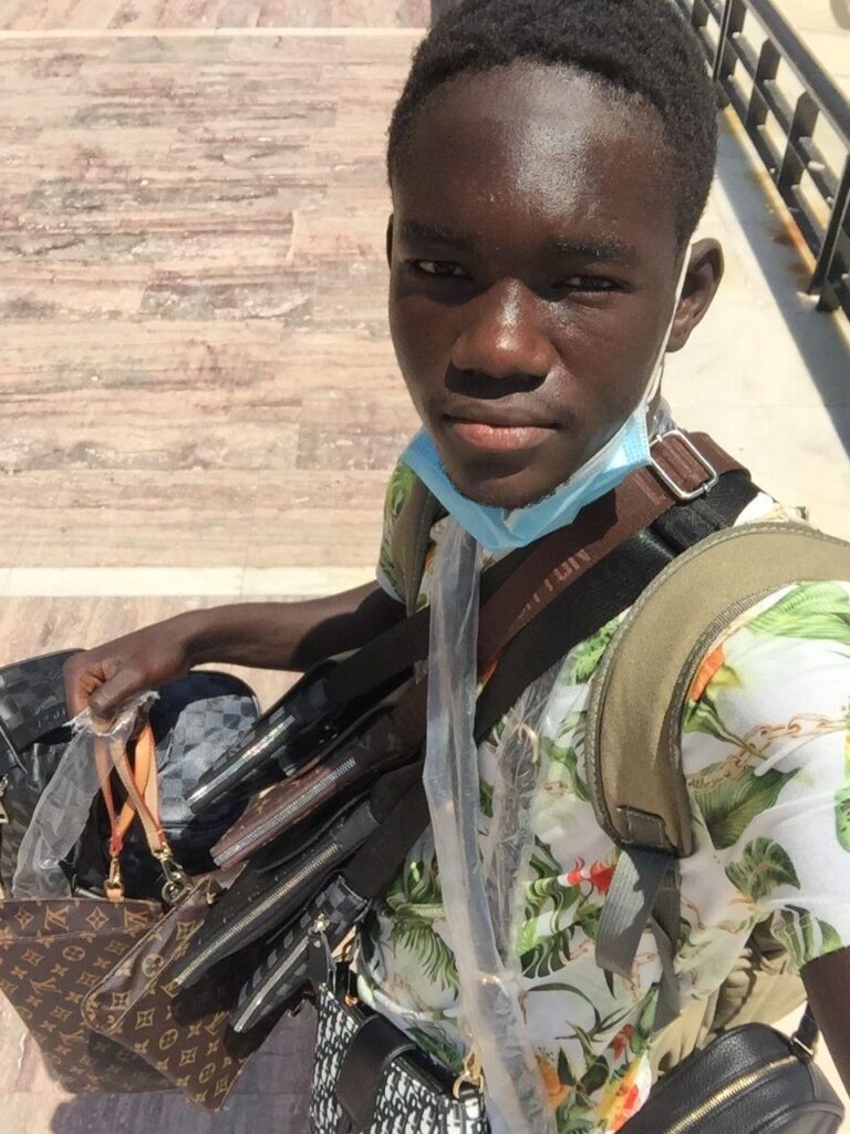 Kane vendiendo bolsos. Imagen cedida.