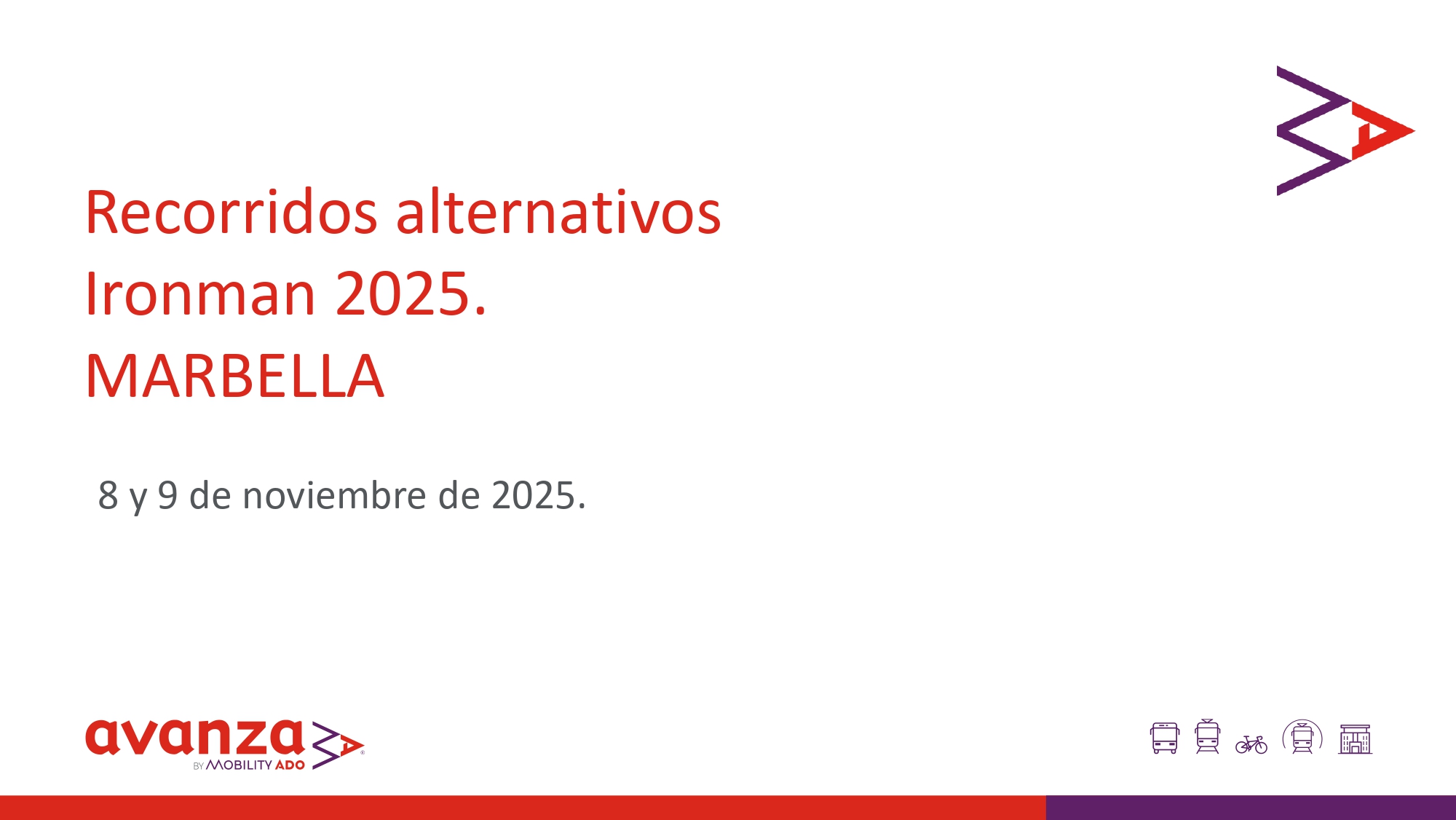 El Ayuntamiento y la concesionaria Avanza han establecido recorridos especiales y alternativos en el servicio de transporte urbano y de largo recorrido con motivo del Mundial del Ironman 70.3, que se celebrará en la ciudad los días 8 y 9 de noviembre, debido a las incidencias que esta prueba de primer nivel ocasionarán en el tráfico en el municipio. Todas las rutas se pueden consultar en la página web municipal en el siguiente enlace https://www.marbella.es/images/docs/trafico/IRONMAN%20MARBELLA%20-%20AVANZA%202025.pdf