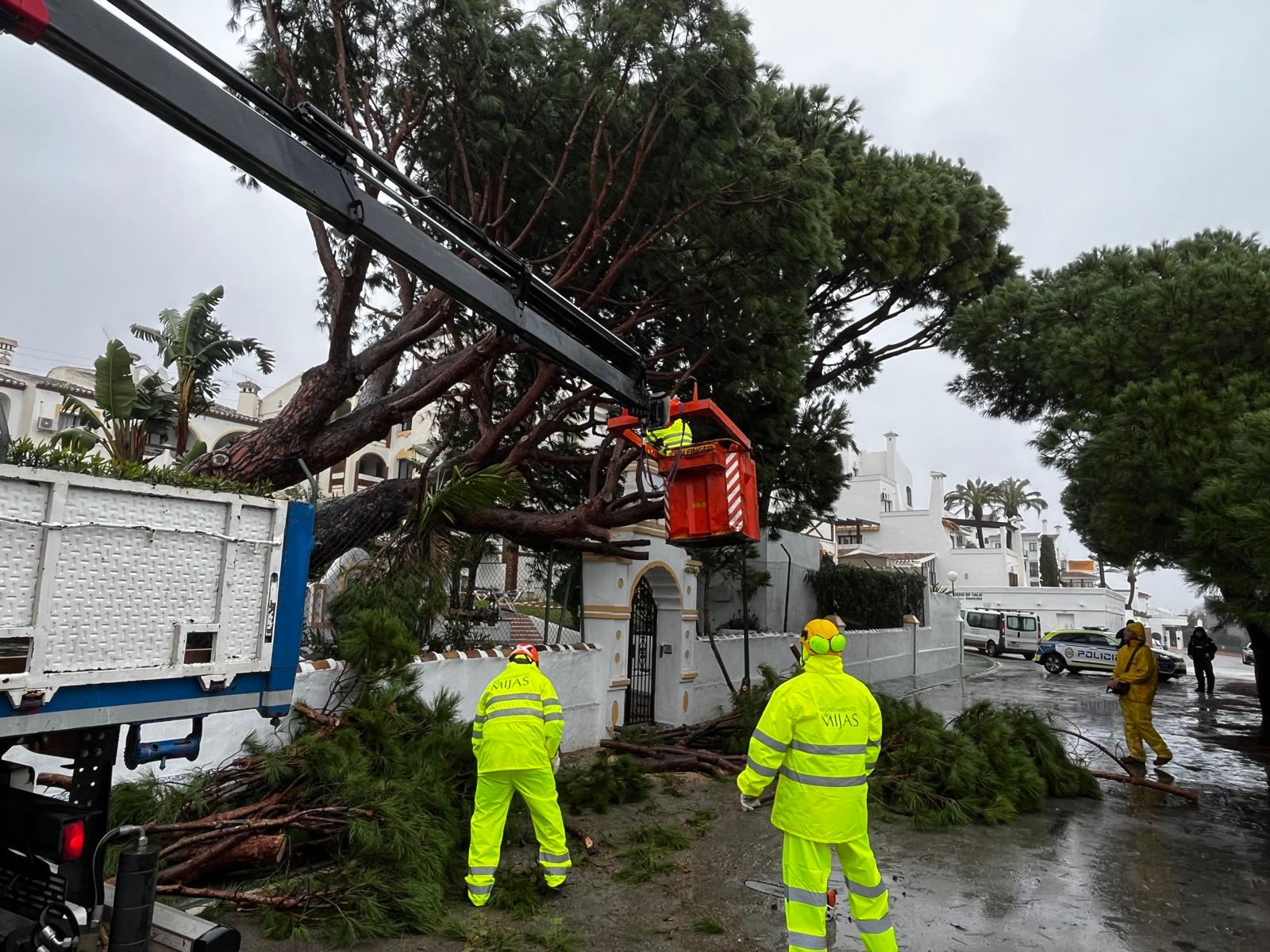 En lo que se refiere a la caída de árboles, estos se han sucedido en Mijas Pueblo Las Lagunas y Calahonda, además de en la avenida Esmeralda y en La Cala. Fue necesaria la intervención ya que estos suponían un riego para la circulación y el tránsito de personas.