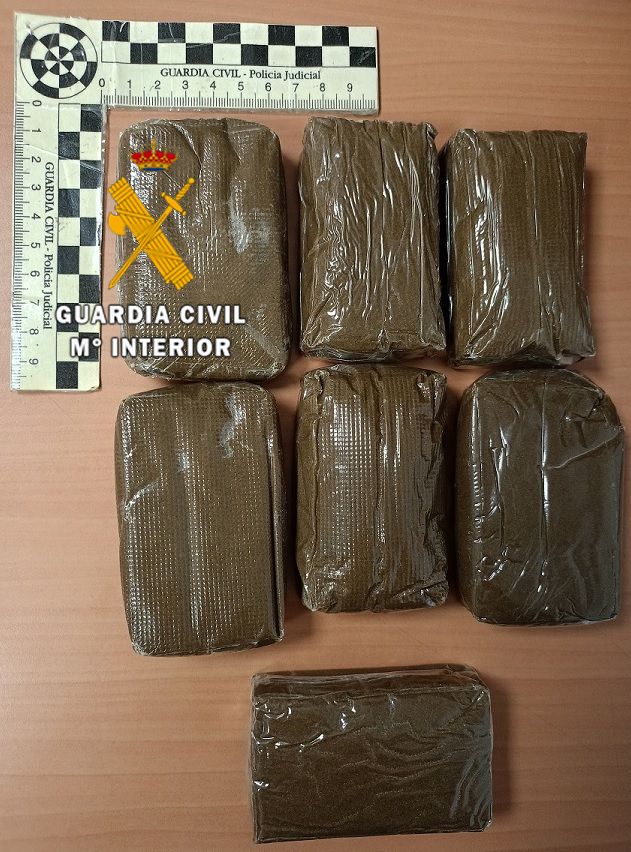 Los guardias civiles bloquearon la salida de los dos ocupantes y recuperaron inmediatamente los bultos lanzados que contenían 7 tabletas de hachís compactadas y listas para su distribución, que arrojaron un peso de 716 gramos.