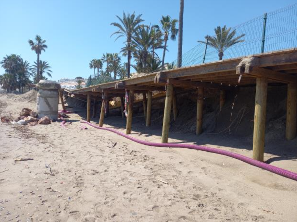 En concreto, el proyecto contempla trabajos de desmontaje y retirada de la pasarela de madera afectada por el temporal; desmontaje y retirada del cerramiento de la urbanización Las Mimosas afectado por el derrumbe; saneo del terreno sobre el que sustenta la estructura; e hincado de pilotes de madera, hasta una profundidad de un metro bajo el nivel del mar como mínimo.