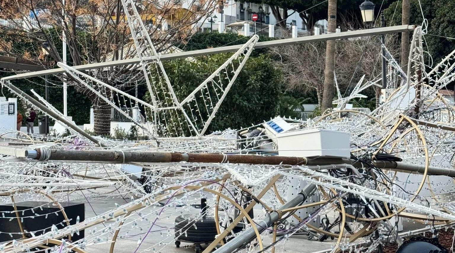 La imagen ha vuelto a repetirse en la localidad de Mijas. El alumbrado de Navidad del pueblo ha sido derrumbado a causa de una fuerte racha de viento que ha azotado a la localidad esta pasada madrugada. Según el Centro Meteorológico de Málaga, se trata de vientos sinópticos del noreste que han podido encauzare llegando a generar fuerzas y velocidades muy elevadas.