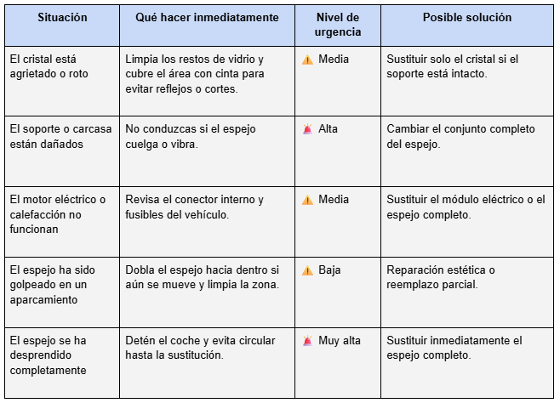 Si el espejo se rompe durante la conducción o al aparcar, detén el vehículo en un lugar seguro y evalúa el daño. Comprueba si el cristal está solo agrietado o si el soporte y el mecanismo de ajuste también están afectados.