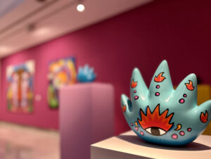 Todas las partes de la exposición rebosan colores y una atracción visual evidente. Nada más entrar se puede apreciar la que es la imagen principal de la exposición: una llama azul. Junto a ella, un elemento muy característico de las obras de Bosska, el ojo con fuego. “El soporte en el que lo he pintado es una escultura de una llama, una llama dentro de otra llama. No sigue ningún patrón, pero realmente tiene todo el sentido del mundo”, explica. Pintura, dibujo digital, escultura e intervenciones específicas en el espacio conforman el recorrido de la muestra, que, además de repasar la trayectoria de la artista, incluye diversas obras inéditas creadas expresamente para esta ocasión. “Entre las obras nuevas tengo cuatro bodegones, lo típico que haces cuando empiezas a pintar. Y estos los he hecho sin perspectiva, sin profundidad ni iluminación, y he conseguido que, pese a eso, haya elementos que se salgan del cuadro y que sean bodegones diferentes, divertidos y sobre temáticas diferentes como golosinas, sushi, zapatillas… Ningún sentido, pero todo”.