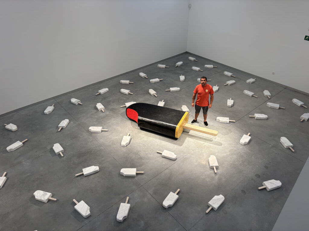 Ya en la última sala, Cuando Calienta el Sol, Quiñones habla del sueño de todo niño cuando llega septiembre, “un verano eterno”, parecido a aquella canción de Luis Miguel, ‘Amor Eterno’. Este espacio es prácticamente una oda al helado, con uno enorme en medio de la sala de unos casi 300 kilos. Sin embargo, reconoce que “no es muy pesada” para las cosas que ha hecho con el mármol a lo largo de su carrera. En los últimos años, la obra de Quiñones ha trascendido fronteras, siendo expuesta en diversas galerías y ferias de arte en Estados Unidos, Europa y China. Además, su práctica, profundamente enraizada en la materia y el gesto, ha resonado en contextos internacionales, confirmando la potencia de un lenguaje escultórico que, desde lo íntimo y lo artesanal, logra dialogar con lo universal.