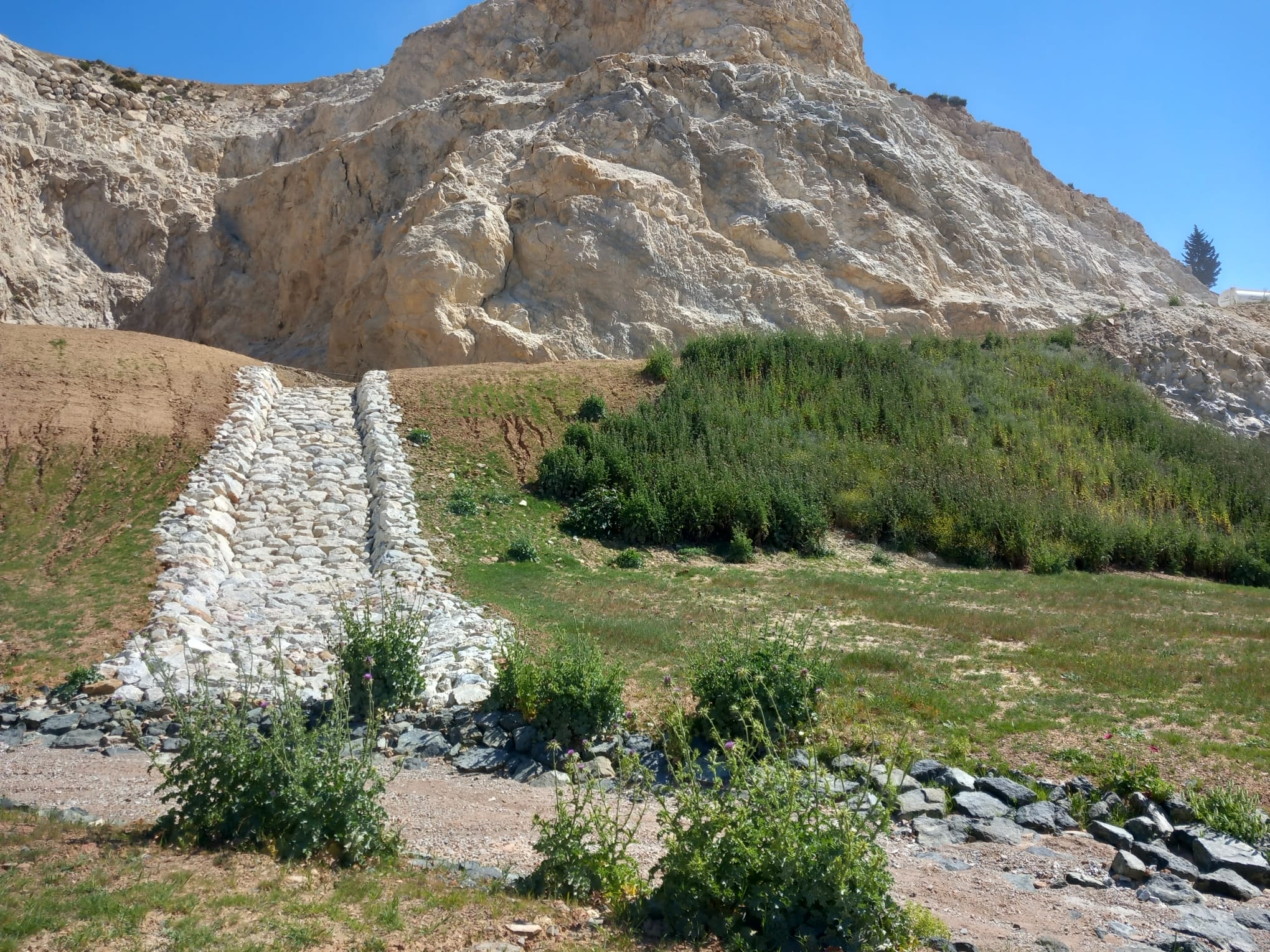 A estas actuaciones se suma la implantación de un sistema específico de captación de gases, basado en pozos verticales y bioventanas que permiten la oxidación del metano, reduciendo así su impacto sobre el clima. De igual modo, se ha diseñado una red de drenaje que canaliza las aguas de escorrentía, evitando su contacto con los residuos y su posible contaminación. La intervención ha incluido también la revegetación del entorno con especies autóctonas, lo que contribuye a la integración paisajística del espacio y favorece la recuperación de la biodiversidad. En este proceso se ha previsto la plantación de 800 adelfas y la siembra de más de mil kilogramos de semillas, generando una cubierta vegetal estable que protege las capas inferiores del sellado.